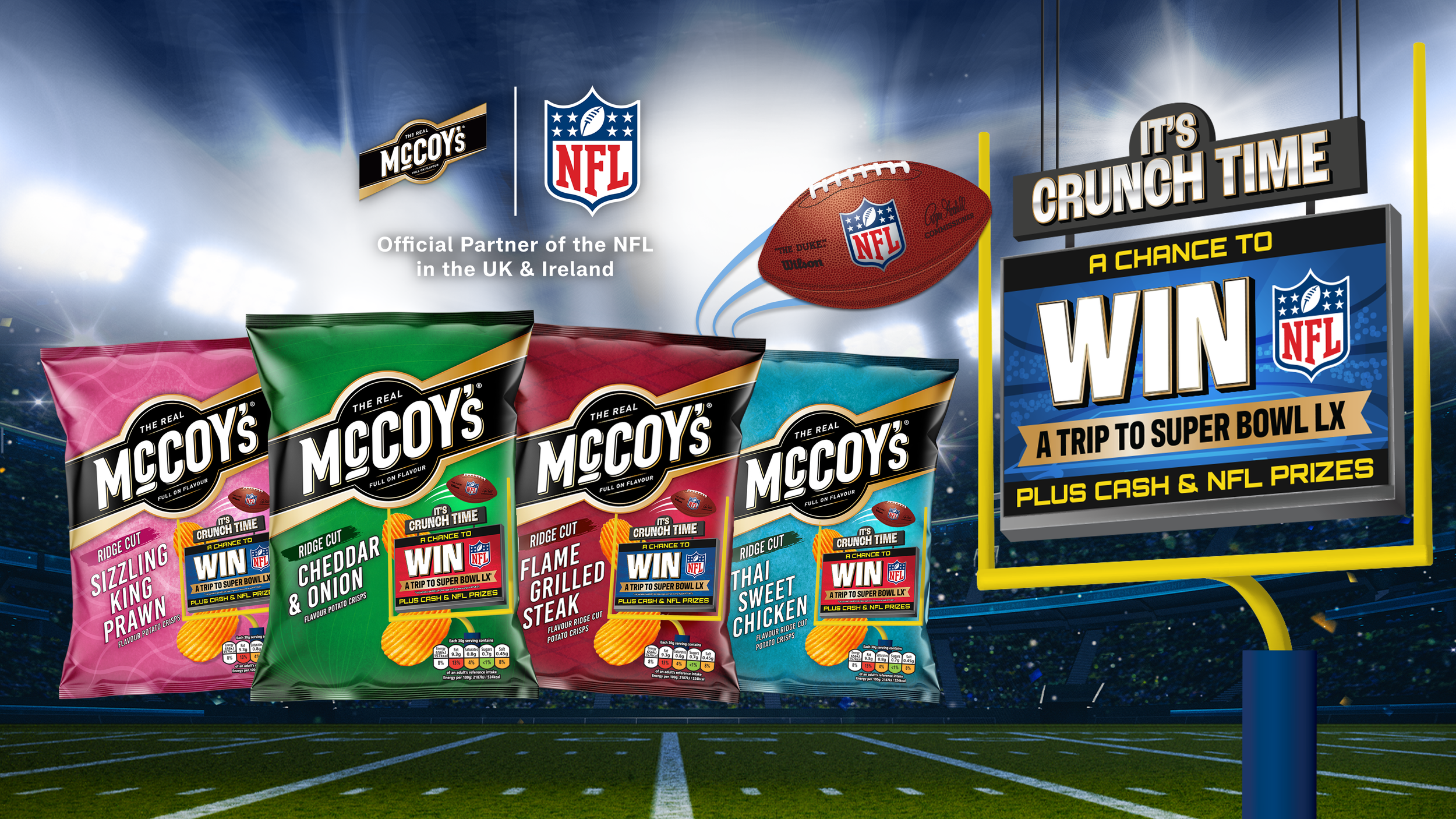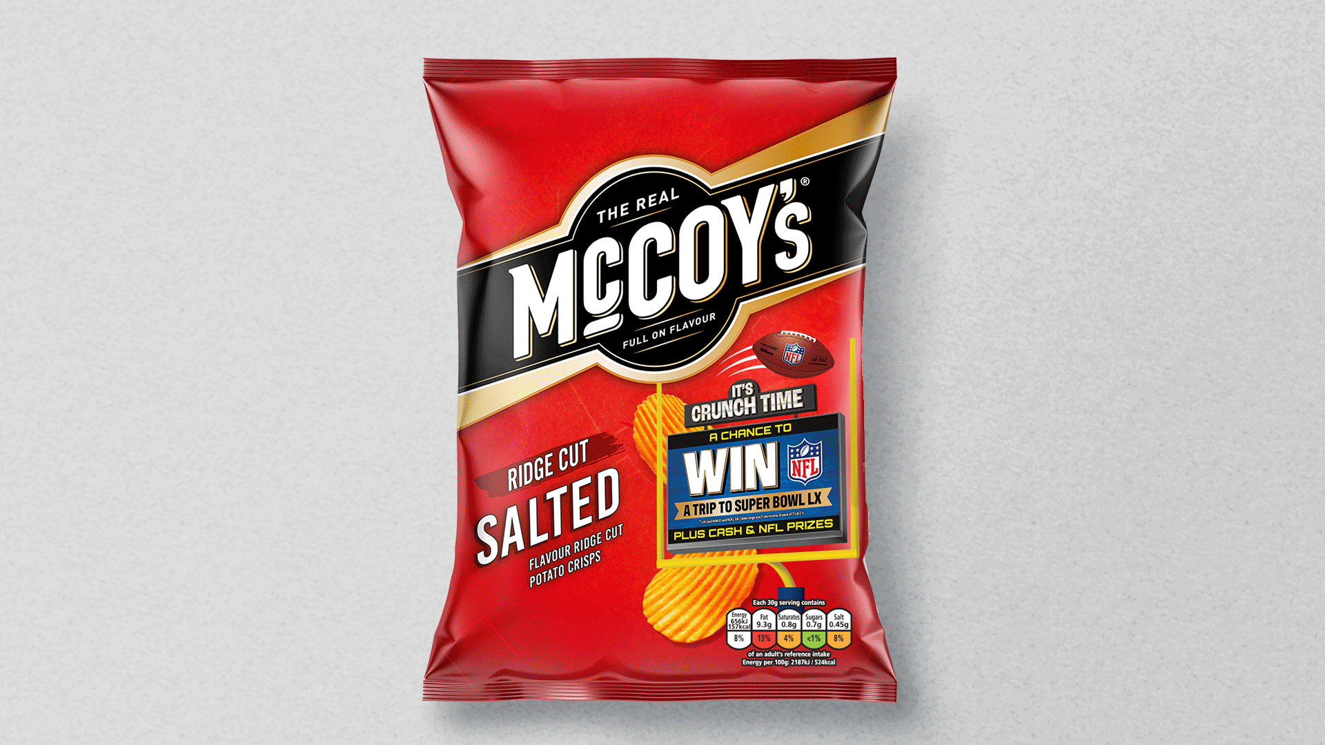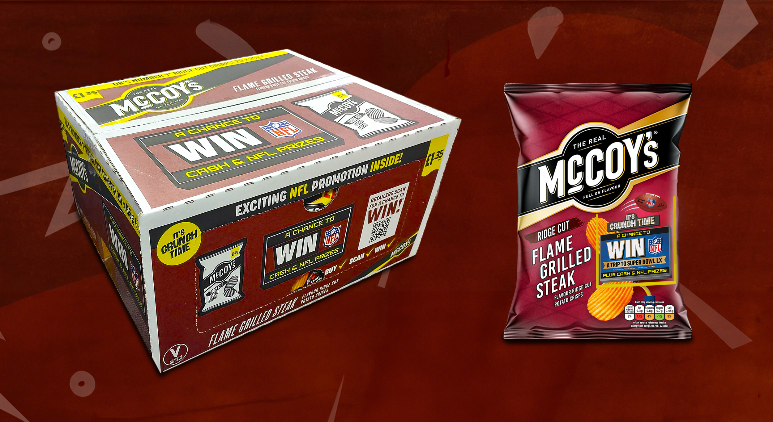 The work extended beyond packaging into a wider shopper campaign, evolving into a cohesive suite across digital touchpoints such as the campaign website. The result is a high impact piece of design that brings together the energy of the NFL with the McCoy’s brand, helping to elevate and promote the chance to win tickets to a Super Bowl experience.